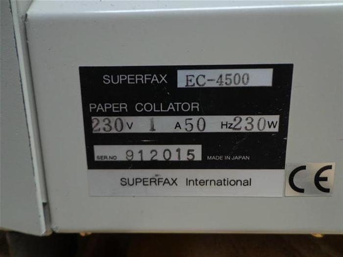 table top collator S UPERFAX EC-4500 n°912015 (made in Japan), 10 bins, for collating all paper sizes from postcard to SRA3 (equivalent to UCHIDA UC-1100) Paper Sizes min. 95x150mm, max. SRA3 (328x465 mm) Friction Feed 35-210 g/sqm 40 or 60 sets/min (A4 Landscape feeding) up to 3600 sets/H. Empty Feed, Paper Jam, Double Feed, No Paper Programs Alternate, Interleaving, Insertion of Front & Back Covers