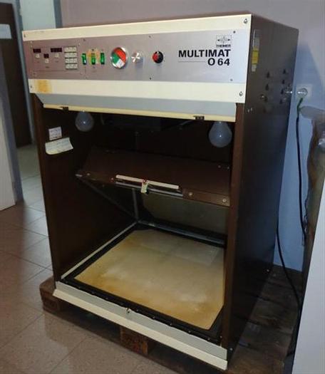 chassis-cabine universel THEIMER MULTIMAT 064 type 318 0 de 1983 n°83110220 pour plaques offset, films lumière du jour ou chambre noire, épreuves couleurs ou copies hélio, format 64x75 cm, à mettre sur une table 3 sources lumineuses (bloc lampe métal halogène Violight 1000W / lampe ponctuelle 50W réglable sur 12 intensités lumineuses stabilisées / 4 lampes diffuses de 200W chacune) sélectionnées par un microprocesseur tableau de commande principal avec computer intégré (computeur de temps de pose KR avec 15 programmes d'exposition) ouverture et fermeture en douceur grâce aux ressorts pneumatiques pompe à vide silencieuse 1 kW - 11A.