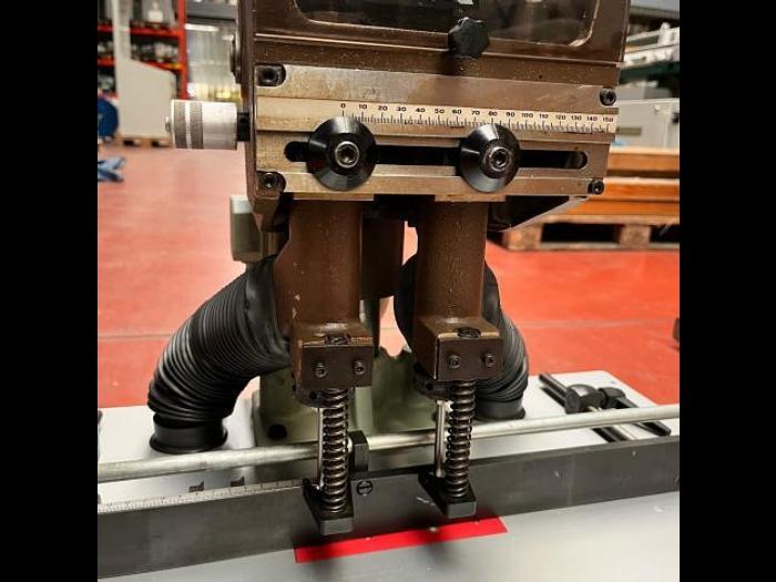 - The drilling heads are adjustable in order to have the drills at the same level. A tooth belt and a drive motor assist the drive of the drilling heads.