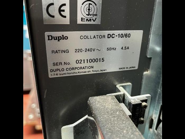 - 1 belt-suction collator DUPLO SYSTEM 4000 Model DC-10/60 n°021100015 year 2002 of 10 bins, with Feed System by Vacuum belt with air sheet separation, double-feed, misfeed, paper jam, paper transport jam and bin empty detections, LCD display,